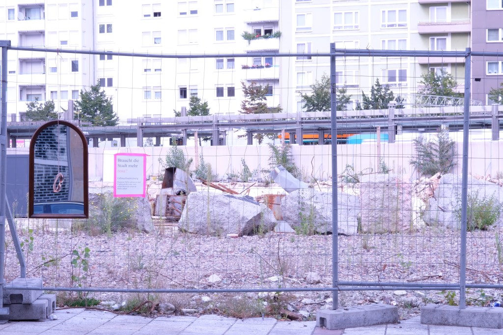 Beim Umherstreifen in der Stadt, angesichts der örtlichen Debatte, ob eine Stadt schön sein muss – oder was überhaupt schön ist – sowie angesichts der Ludwigshafener Mitte, in der ein Bauloch prangt fragte ich mich, ob die Stadt mehr rosa braucht. Hieraus entstand eine Fotoserie am „Loch“ (Berliner Platz) sowie zwei kleine interaktive Installationen mit Spiegel und rosaroten Brillen: „Gebrauchsanweisung: Rosarote Brille aufsetzen und Ludwigshafen oder dich selbst durch die rosarote Brille sehen!“